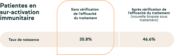 Chez ces femmes nous avons trouvé une dérégulation de l’environnement immunitaire dans 81,5 % des cas. Le deuxième tableau compare les résultats des patientes en sur-activation immunitaire ayant fait une tentative directement après leur résultat par rapport à celles en sur-activation immunitaire qui avant de refaire une tentative ont vérifié l’efficacité du traitement (en réalisant une biopsie avec le traitement proposé). Pour ces dernières, en fonction des résultats de cette deuxième biopsie, le traitement a pu être modifié.