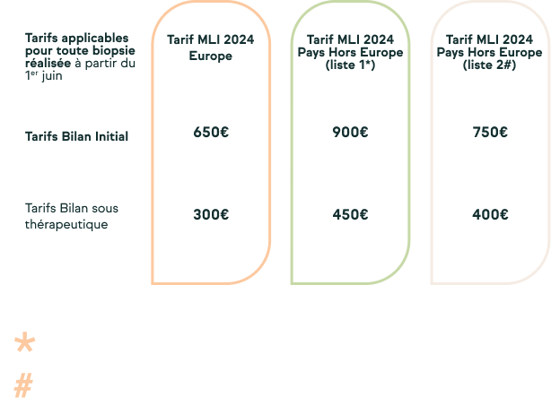 Le tarif bilan sous thérapeutique est valable uniquement pour les biopsies effectuées avec le traitement proposé dans MatriceLab Innove et réalisé dans les 6 mois suivant la première biopsie (bilan initial)